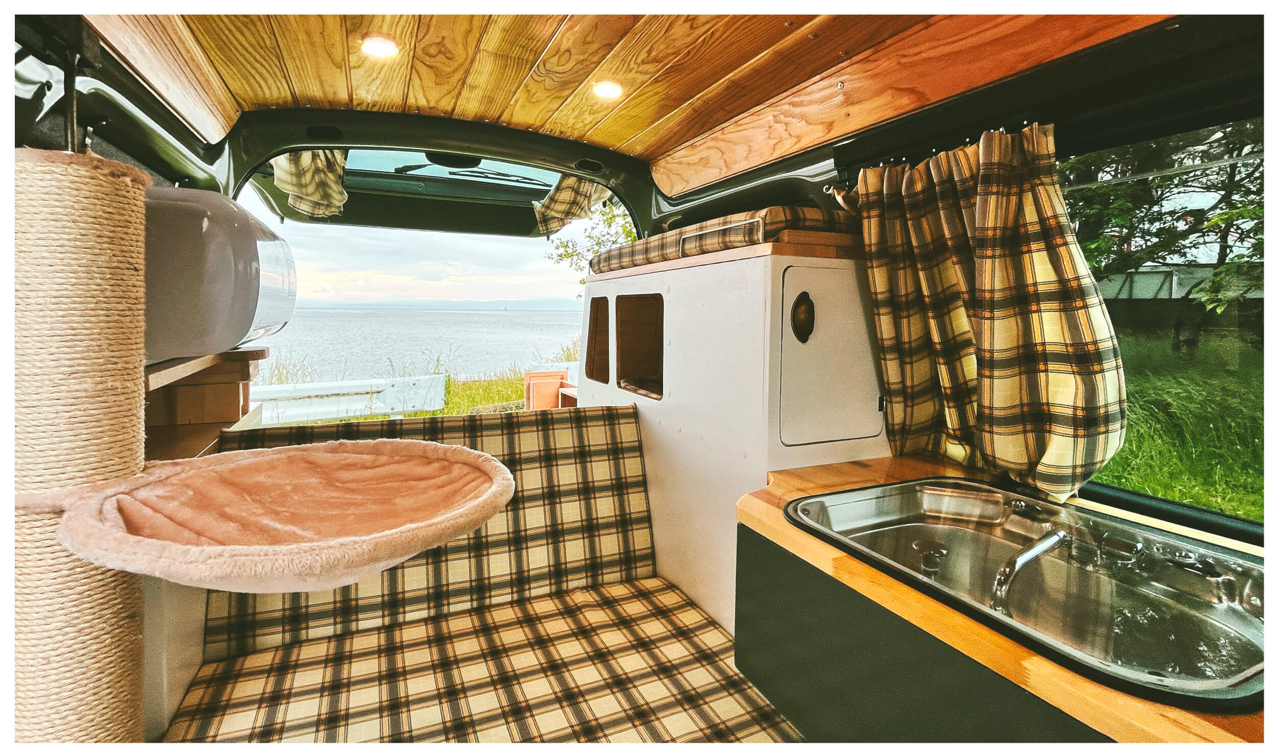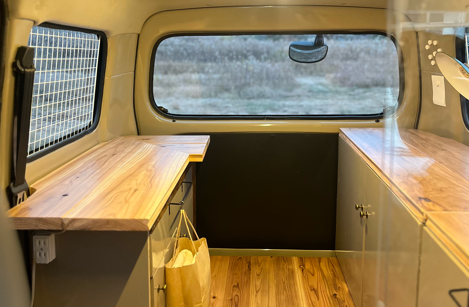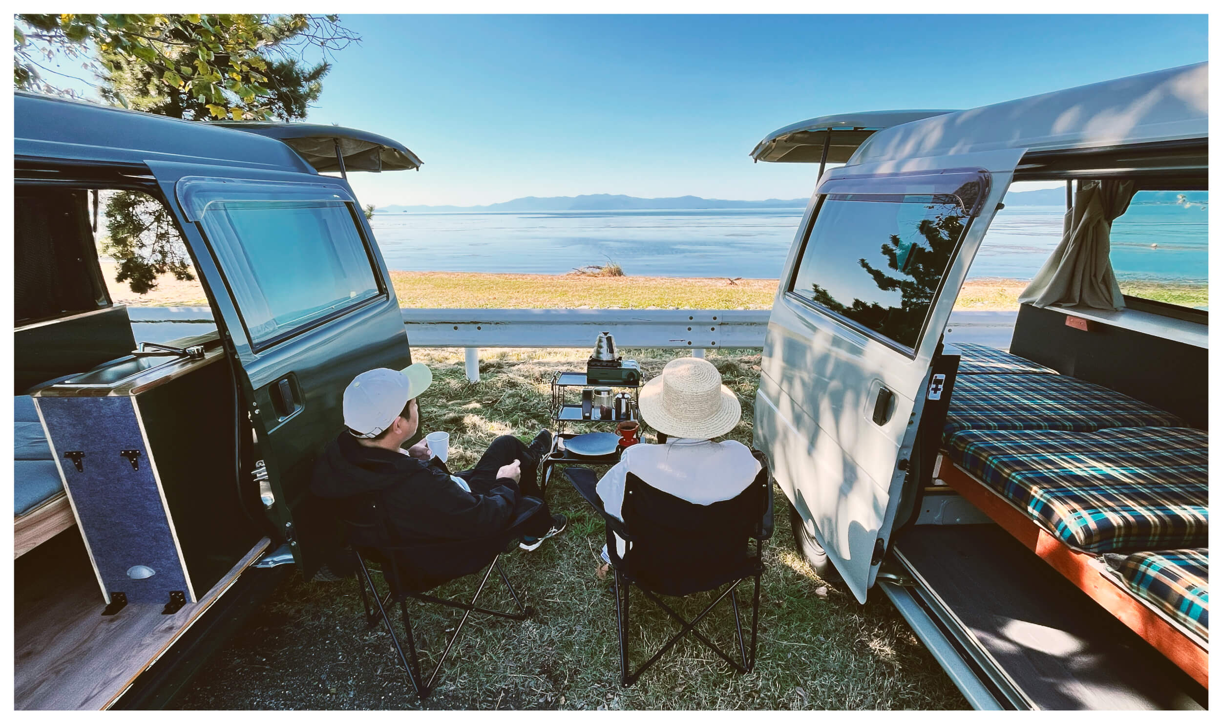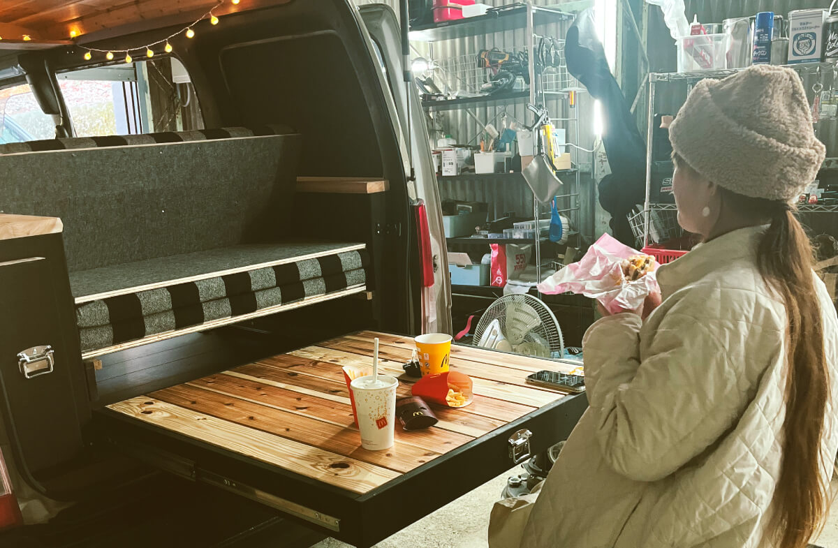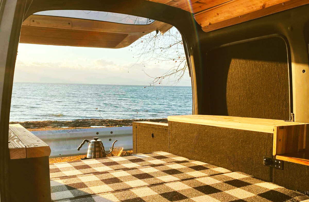お出かけ先でコーヒーを淹れたり、車内で作業したり、寝転んだり。